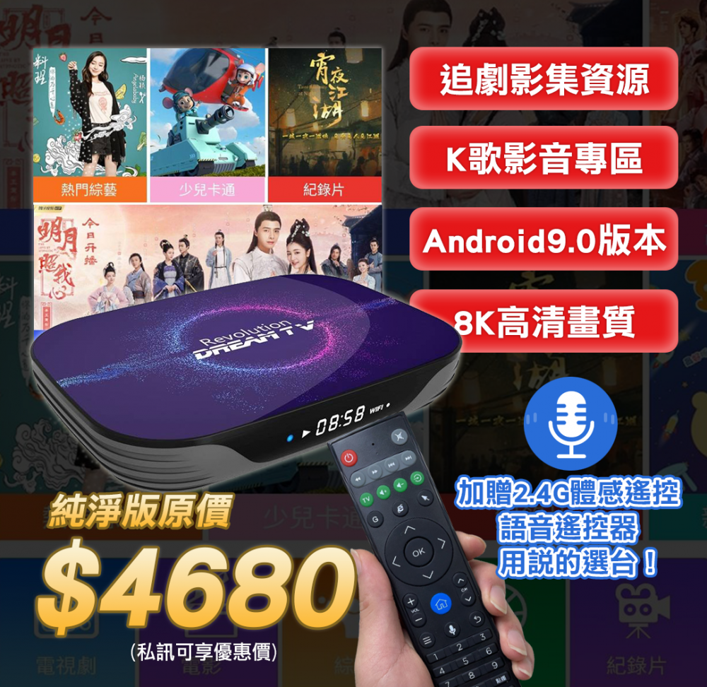 原廠配件: 夢想盒子主機*1 電源線*1 2.4G語音遙控器*1 HDMI線*1 說明書*1 原廠保固卡*1(保固20個月)